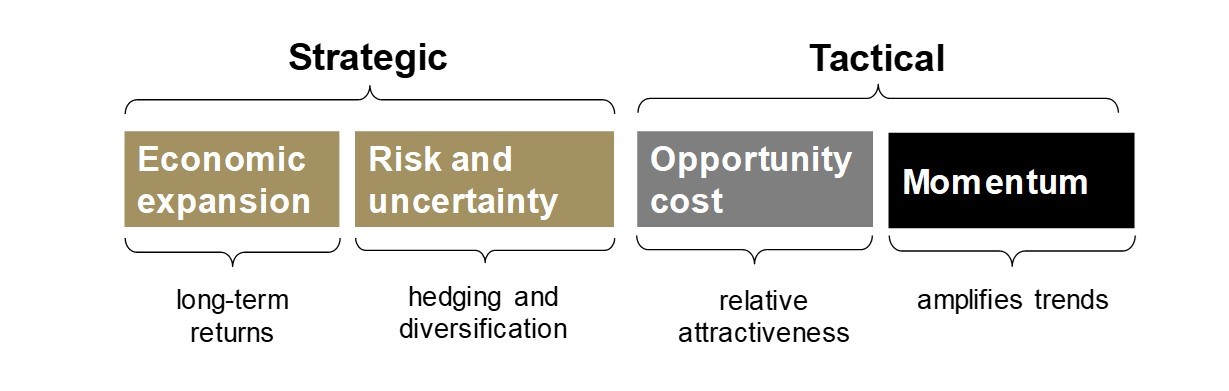 - Momentum: capital flows, positioning and price trends can ignite or dampen gold's performance.