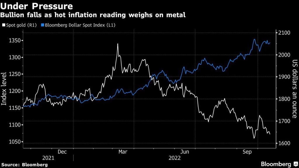 Following a slight rebound earlier this week, the precious metal has now reversed course as data showed UK consumer prices in September matched a 40-year high and exceeded economists’ expectations. The figures add to pressure on policy makers to lift interest rates significantly, weakening the attraction of the non-yielding bullion.