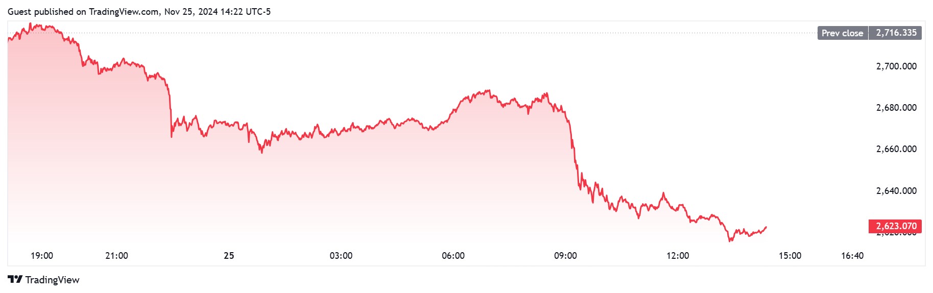 Gold has sold off steadily throughout Monday’s trading session. Since opening above $2,711 per ounce, spot gold lost nearly $100 on its way to the $2,615,67 low set at 1:23 pm EST. It last traded at $2,623.02 per ounce for a loss of 2.44% on the daily chart.