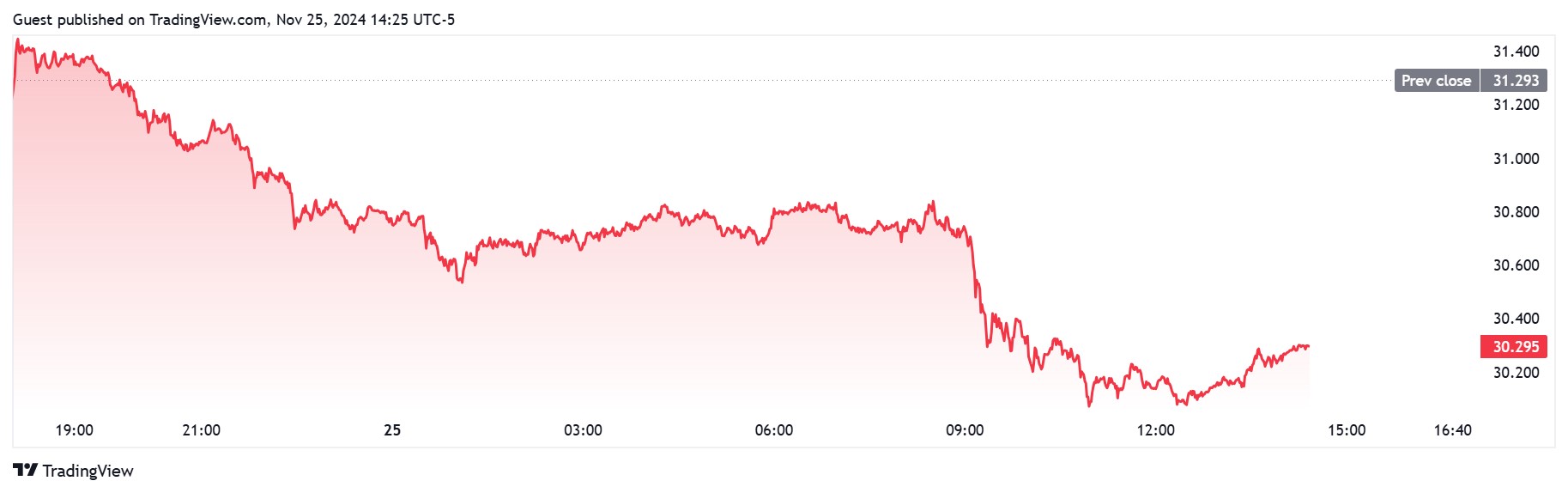 Meanwhile, silver prices have also slid below $31 on Monday, last trading at $30.298 per ounce for a loss of 3.18% on the session.