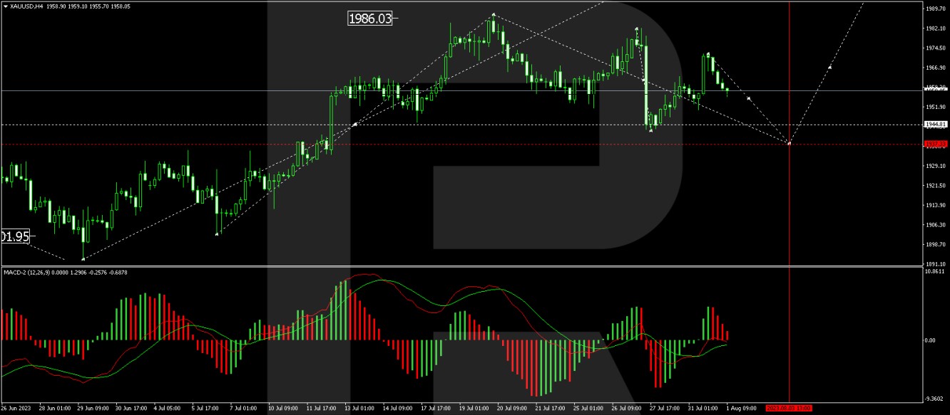 On the H4 chart of Gold, the upward wave towards the level of 1986.00 has been completed. Currently, we are considering the development of a correction. Its structure suggests a 1937.33 target. Once this correction is completed, we expect the price to rise towards 1995.55. This scenario is technically supported by the MACD indicator, as its signal line is below the zero mark and is pointing downwards.