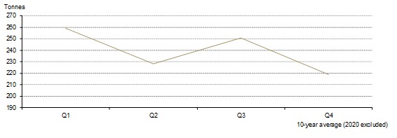 10-year average quarterly gold consumption (jewellery + investment)