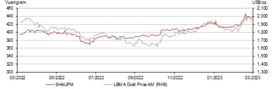 - Both Shanghai Gold Benchmark PM (SHAUPM) in RMB and the LBMA Gold Price AM in USD surged in March, ending Q1 with sizable returns
