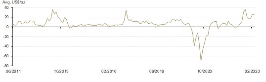 The Shanghai-London gold price spread in Q1 averaged US$23/oz, significantly higher than previous quarters. Notable recoveries in local gold demand drove the premium rebound during the quarter. For more, watch for our upcoming 2023 Q1 Gold Demand Trends report.