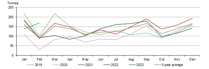 The rebounding Shanghai-London spread, continued improvement in local demand and the industry’s need for stock replenishment after the CNY holiday. all lifted February imports. As a result, January and February’s combined imports of 244t saw the strongest start to a year since 2015.