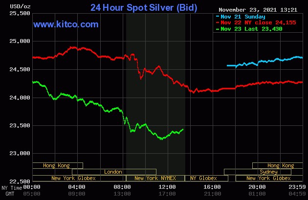 (Kitco News) - Gold and silver prices are again solidly lower in midday U.S. trading Tuesday. Follow-through selling is featured after strong losses posted Monday. The bulls are fading fast and need to step up and show fresh power very soon to avoid serious near-term technical damage being inflicted and to revive their price uptrends on the daily bar charts. December gold was last down $21.90 at $1,784.40 and December Comex silver was last down $0.902 at $23.395 an ounce.