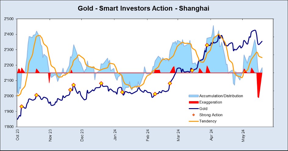 What’s the situation in day trading? Interesting! The gold price recently corrected slightly again. And my analysis of gold trading in China immediately showed massive “exaggeration” (red area), an exaggeration to the downside, which is usually answered with a counter-reaction. Very bullish!