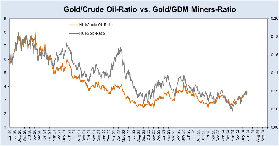 For many, the performance of the HUI Index to date has been disappointing. However, it is important to remember that the Oil price is a very important cost factor for Gold production. Accordingly, there is a very high correlation between the ratio of the HUI gold mining index and the Oil price as well as the ratio between the gold price and the HUI: if the Oil price falls in relation to the Gold price, the shares of Gold miners can see high profits…