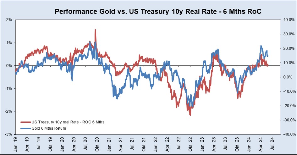 Many market participants continue to pay attention to real market yield and therefore see no reason to invest in Gold. There is no longer any correlation. Not true, the Gold price does indeed continue to correlate with the US bond market, just in a different way: the percentage changes over the last six months, an almost perfect correlation…