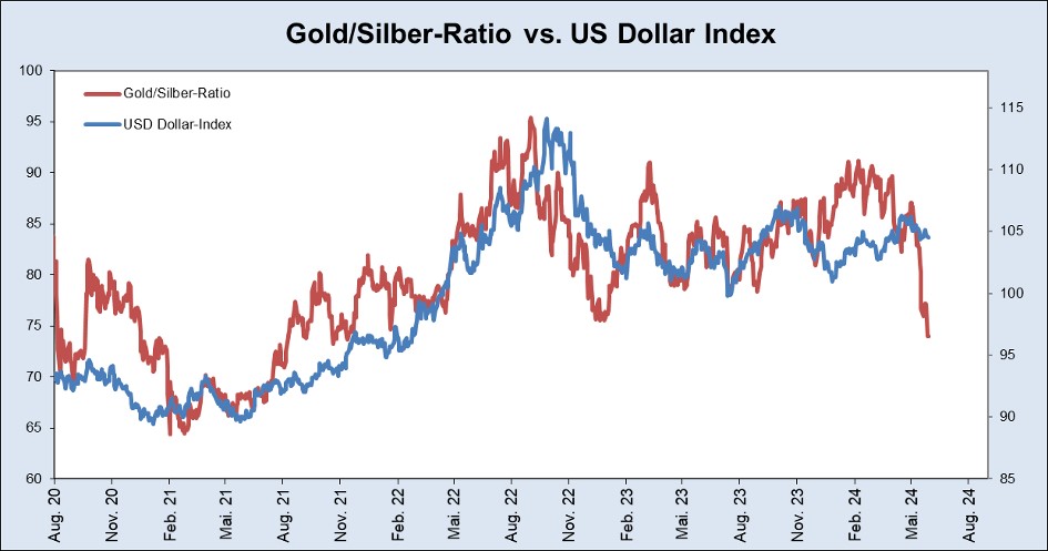 There is an equally almost perfect correlation between the US Dollar and the Gold/Silver ratio. The precious metal Silver is increasingly becoming an industrial metal due to demand for PV. Pessimistic economy, the ratio rises. Optimistic economy, the ratio falls. Recently, the ratio has fallen massively. It will now be interesting to see what happens to the US dollar…