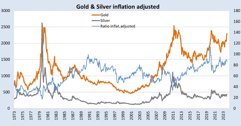While the Gold/Silver ratio has fallen, Gold and Silver performed very well. Are they now expensive? Not adjusted for inflation. Adjusted for inflation, the top for Gold is just over USD 2500. Silver has two important inflation-adjusted highs in the past: 2011 at around USD 70, 1980 at around USD 152. The Gold/Silver ratio was already around 90 in the 1990s, adjusted for inflation… But almost 50 years ago it was just under 30…