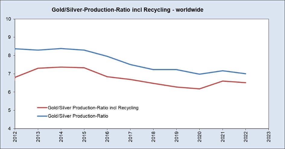 Geologically, the Gold/Silver ratio is between 15 and 20. If it were based on annual production over the last ten years, it would have to be in the region of 7… (2023 production numbers will be updated soon…)