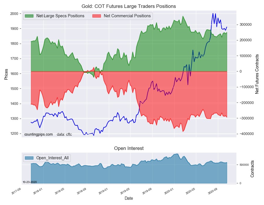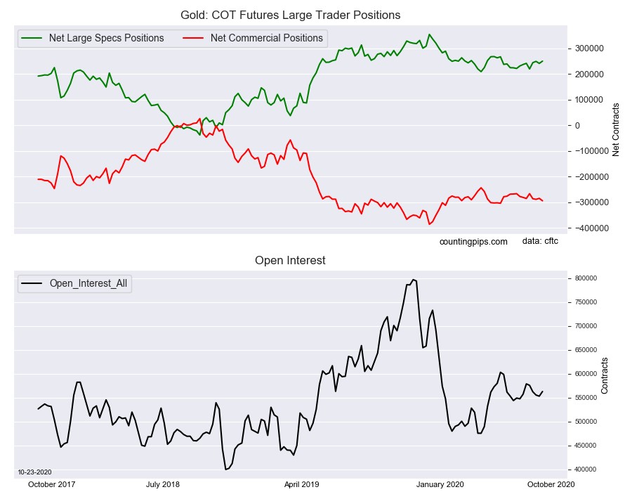 Gold COT Futures Large Trader PositionsThe non-commercial futures contracts of Gold futures, traded by large speculators and hedge funds, totaled a net position of 249,604 contracts in the data reported through Tuesday October 20th. This was a weekly boost of 8,933 net contracts from the previous week which had a total of 240,671 net contracts.