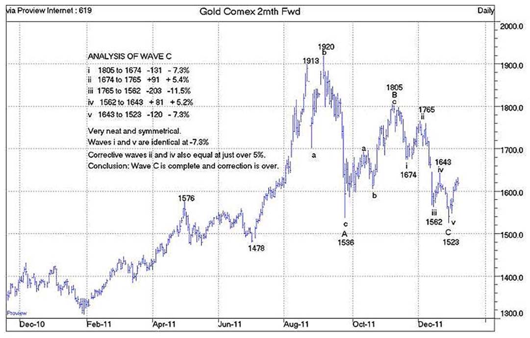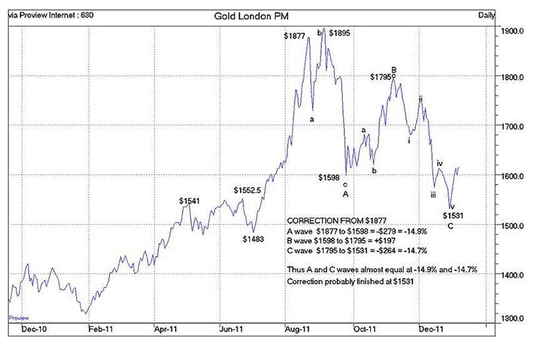 There is a strong probability that the correction in the price of Gold has been completed. In Elliot Wave (EW) terms, the correction consists of three waves, an A wave down, a B wave rally and a final C wave decline. There is usually a relationship between the A and C waves. Often they are equal or have a Fibonacci connection.