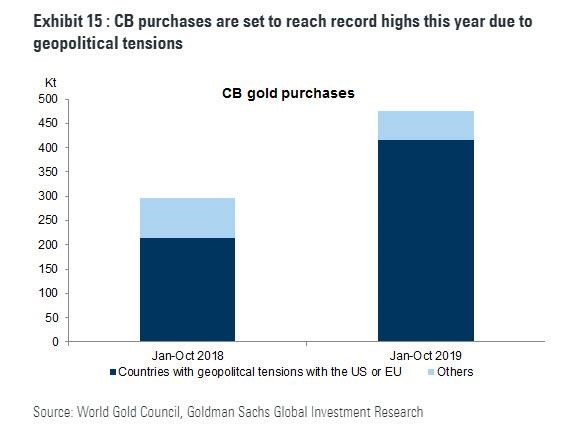 Take gold: as we reported last week, it was none other than Goldman Sachs which recently laid out the case for gold, saying "gold's strategic case still strong." One reason for this is that the same central banks that are "full tilt" printing cash, they have also been splurging on gold, and as a result of "geopolitical uncertainty" there has been a record surge in gold demand by central banks themselves. As Goldman notes, "CBs globally have been buying gold at a very strong pace" and "2019 looks to be a record year for CB gold purchases with our target of 750 tonnes combined purchases likely to be met."