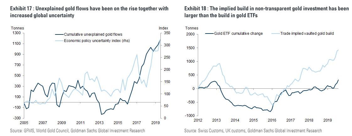 As Goldman's Mikhail Sprogis writes, "rising political risk - together with negative European rates - may be an important reason behind the large share of unaccounted gold investment over the past several years. Exhibit 17 shows cumulative unexplained gold demand based on World Gold Council (post 2010) and GFMS (pre 2010) balances data. It surged since 2016. Similar dynamics can be seen when we look at implied vaulted gold stocks built in the UK and Switzerland, which is calculated as implied cumulative total net imports minus transparent ETF gold stocks."