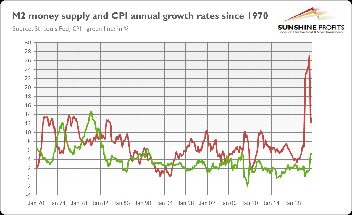 Let’s look at the chart below, which displays the annual growth rates in the broad money supply (M2, red line) and in the CPI (green line). We can notice two important things. First, in the 1970s, the pace of broad money supply growth was relatively high, as it reached double-digit values at some point. As a consequence, inflation accelerated, jumping above 10% for a while. In other words, stagflation was born.