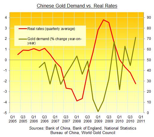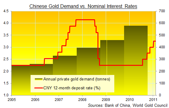 China’s experience may not be typical, but it’s certainly worth examining. China is the world’s second biggest gold market after India. The latest World Gold Council data show that China accounted for one quarter of global gold consumption by tonnes in the first three months of 2011.