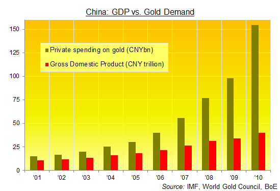 India, the only country that buys more gold than China, spent 2.5% of its GDP on gold in 2010. The figure for China, by contrast, was just 0.4% (if Chinese consumption had been at Indian levels, China would have bought just under 3,000 tonnes of gold - or 78% of 2010 global demand).