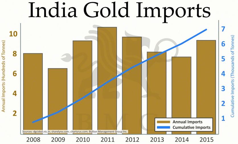 Despite India’s long-standing love affair with gold, it only recently began making large annual purchases. Back in 1982, India only consumed 65 tonnes of gold. Imports were banned until about 1990 and, as a result, most of the gold consumed came via smuggling. The premium then was about 50% to the price of gold, well above today’s minimum 10% premium. At that time, poor farmers bought gold as currency and collateral to get them through hard times. Farmers also used gold as collateral to reacquire their land from local landlords. The chart below shows the huge imports that India now regularly consumes.
