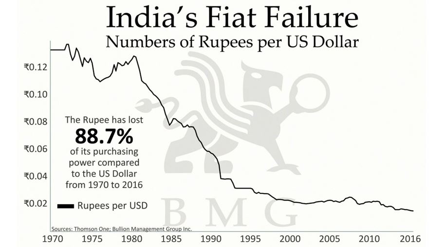 The people of India have never experienced a bear market of any consequence in gold. Since 1970 the Indian rupee has lost 88.7% of its purchasing power compared to the U.S. dollar. But the people’s purchasing power has been maintained thanks to gold. The first chart shows India’s fiat failure, with the rupee falling sharply in purchasing power. The second chart demonstrates how India’s purchasing power has been maintained thanks to the rising price of gold. The people of India have never experienced a bear market in gold. Gold may be intricately intertwined with their beliefs and their culture, but it has also allowed to the people to maintain and preserve their wealth. Maybe that explains why the people are reluctant to give up their gold for a piece of paper from the government. Westerners may have something to learn from India’s love affair with gold.