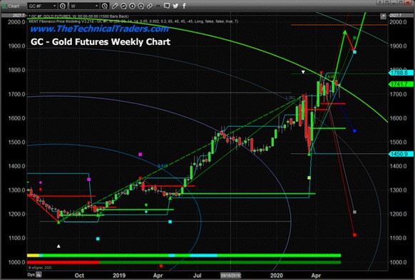 While the US stock market has rallied over the past 5+ weeks, Gold has stalled near $1730 to $1740. We issued a research post suggesting the GREEN Fibonacci Price Amplitude Arc was acting as major resistance and once that level is breached, we expect a big upside move in Gold. Currently, Gold has reached just above the Green Price Amplitude Arc and this week may be a critical moment for both Gold and Silver in terms of a momentum base.