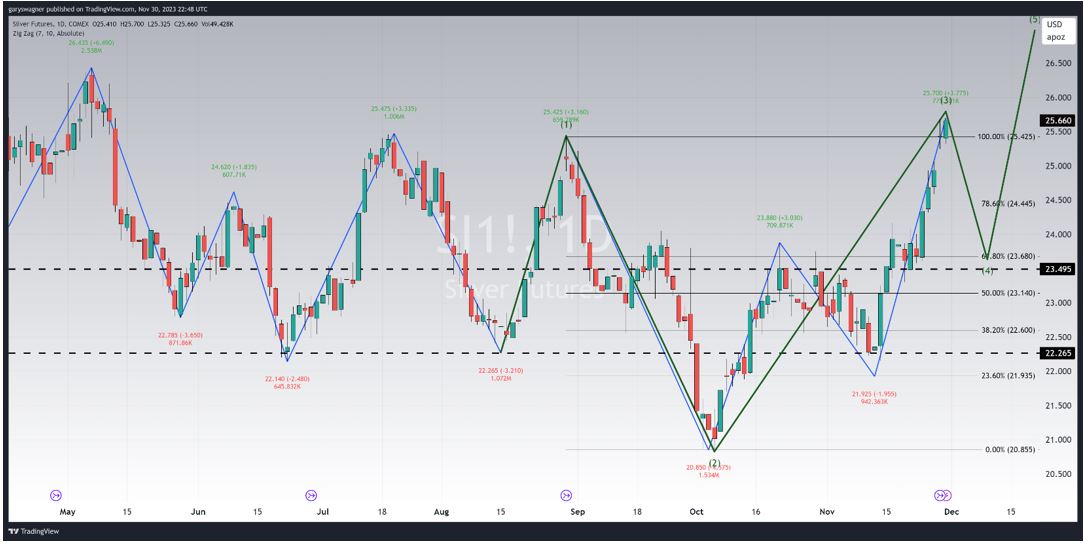 From the beginning of October to the last day in November silver has had a profound and dramatically strong gain. This despite one moderately deep correction beginning on October 19, and concluding on November 13. Monday, November 13, was the exact day that Silver pivoted back to a bullish demeanor. During the short span of a couple of weeks, silver futures traded from their lows at $21.93 to their current fix of $25.67.