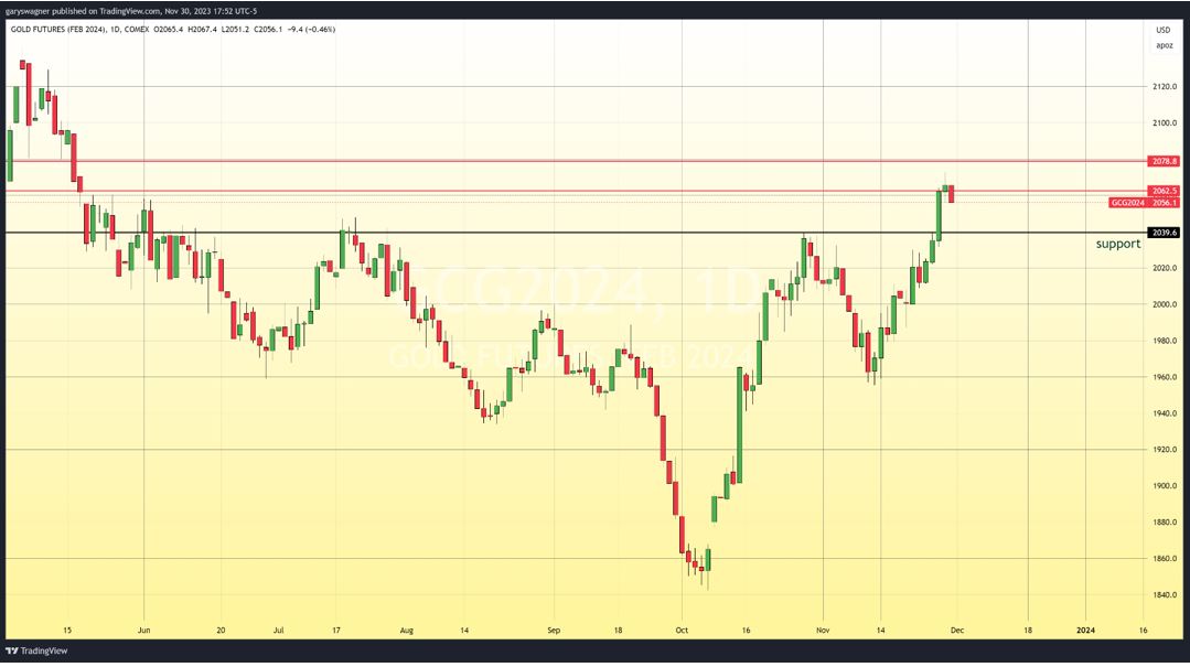 Gold also ran a very parallel course with its rally beginning during the first week of October when it was trading at a mere $1840 per ounce, to the conclusion of the first leg of this rally occurring on Friday, October 27 at approximately $2040. Like silver, a strong correction followed taking gold to $1960 during the middle of November. Both precious metals resumed the rally with a vengeance once they individually completed their correction.
