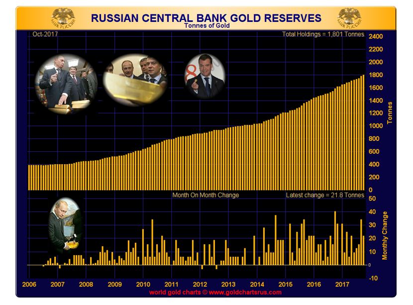 With the Chinese central bank still officially claiming to hold 1842 tonnes of gold in its national gold reserves, its looks like the Bank of Russia, as soon as the first quarter 2018, will have the distinction of holdings more gold than the Chinese. That is of course if the Chinese sit back and don’t announce any additions to their gold reserves themselves.