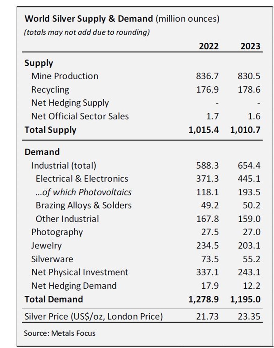 With demand consistently outpacing supply for the third year in a row, the market faced a structural deficit of 184.3 Moz. The World Silver Survey 2024, released by the Silver Institute, examines key aspects of the 2023 silver market and provides an outlook for this year. It was produced by London-based precious metals consultancy