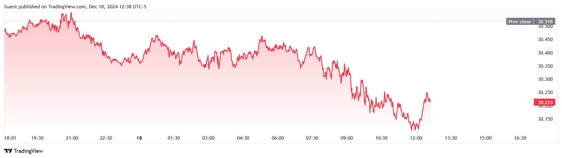 Silver has been in steady decline throughout Wednesday’s trading session, with the spot price testing support just above the critical $30 per ounce level multiple times ahead of the Fed’s 2 p.m. EST rate decision.