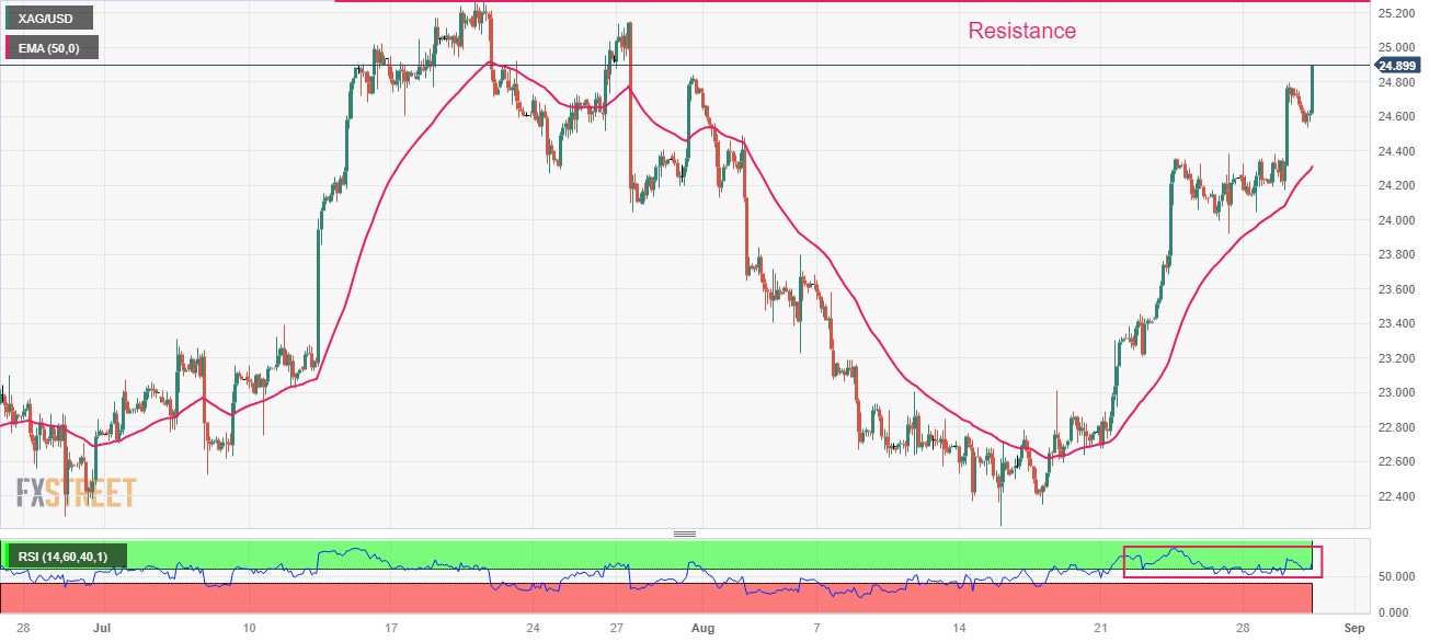 Silver price is approaching the horizontal resistance plotted from July 20 high around $25.27 on a two-hour scale. Upward-sloping 50-period Exponential Moving Average (EMA) indicates that the upside momentum is extremely bullish.
