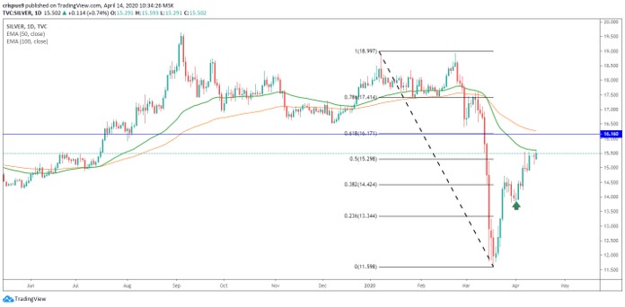 Looking at the four-hour chart, we see that silver has been rallying after hitting a YTD low of 11.73 in March this year. The metal’s price has surged to above $15, which is above the 50% Fibonacci Retracement level on the four-hour chart. The price is also along the 50-period exponential moving averages.