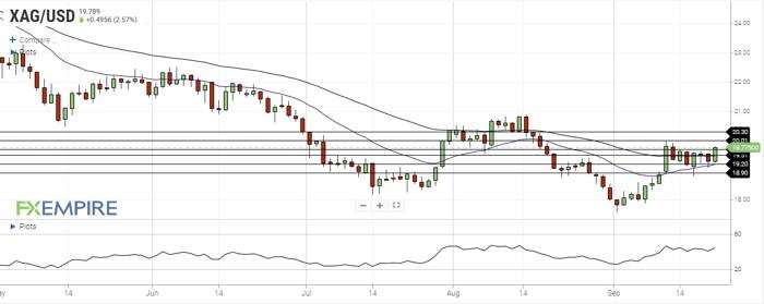 - Silver is up by almost 3% and looks ready to test the key resistance at the $20.00 level.