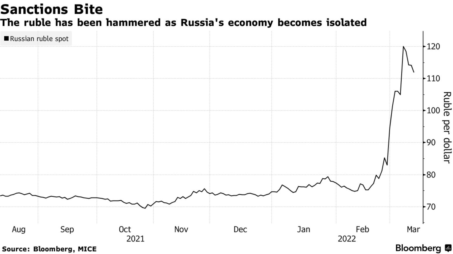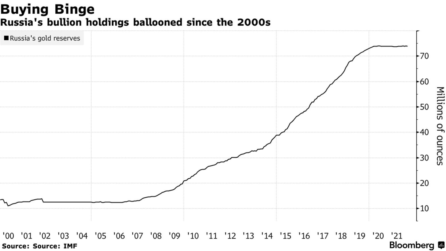 Bank of Russia expanded its gold reserves almost sixfold since the mid-2000s, creating the world’s fifth-biggest stockpile that’s valued at about $140 billion. It’s the type of asset it could sell to shore up the ruble, which has plunged as global economies isolate Russia following its invasion of Ukraine.