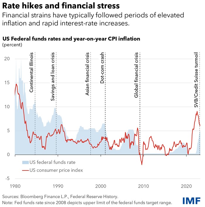 The report points out that financial crises often are preceded by monetary tightening. The chart below from the IMF website maps the US fed funds rate with major financial stress periods highlighted.