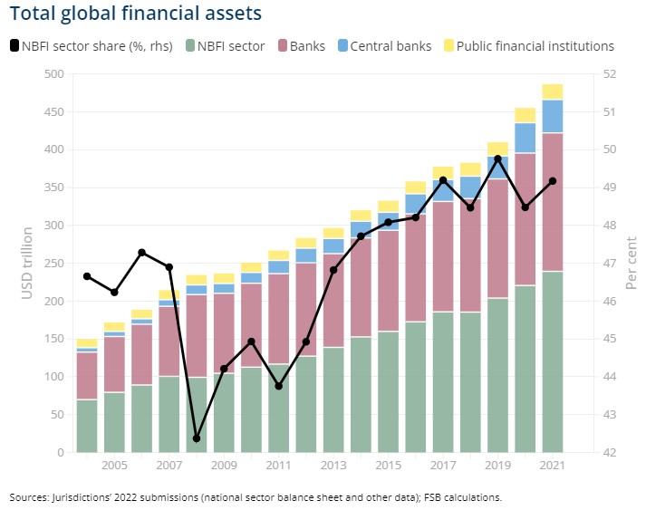 The NBFI sector is significant, in fact the Financial Stability Board estimates that the NBFI sector accounted for US$239.3 trillion (49.2%) of the $486.6 trillion in total global financial assets in 2021.