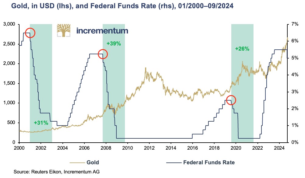 He said the current cutting cycle should boost the gold price once again. “That has been the case in each of the three phases of interest rate cuts since the turn of the millennium,” Stoeferle said. “At the beginning of the 2000s, the price of gold rose from USD 270 to around USD 420, or by almost 60%, during the cycle of interest rate cuts following the bursting of the dot-com bubble. In the years of interest rate cuts following the global financial crisis of 2007/2008, the gold price soared from around USD 660 to around USD 1,600, or by more than 140%.”