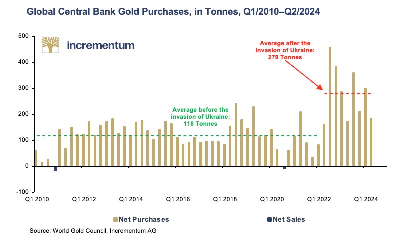 “Among central banks, while China noticeably slowed down its pace of accumulation in Q2/2024, India accelerated it just as noticeably,” he pointed out. “In Q2/2024, India increased its gold reserves by 18.7 tonnes, only slightly less than Poland did. In Q1/2024, India bought only marginally less. The Bank of India thus increased its gold reserves by 4.6% in just half a year.”