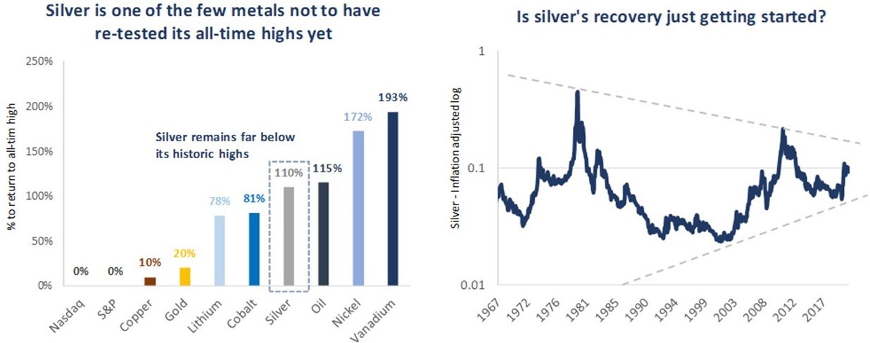 We consider that precious metals are midway through a long-term upcycle, driven primarily by expanding money supply, persistent low and negative real interest rates, rapid debt expansion and ultimately fiat currency debasement. The gold price made new highs in 2020, boosted by concerns over the economic impact of the COVID-19 pandemic, while silver has made encouraging gains since its lows in the middle of the last decade. Despite the sector’s progress in recent years, we believe silver’s recovery may be just getting started. Historically when gold makes new highs, so does silver, and so the very fact that silver has not yet retested its all-time highs in this cycle is in itself an indication that there is much more to come from the metal.