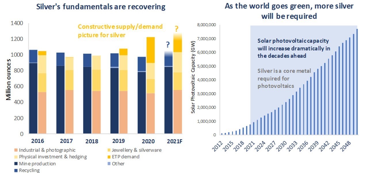 The past 12 months have been a frustrating period to be a silver investor, with silver prices having fallen by around 16% since the summer highs of 2020 and with silver miners under pressure. Baker Steel has maintained a sizable silver weighting during this period and, while this has dragged from time to time on the relative performance of our strategies, we maintain our conviction for two core reasons: