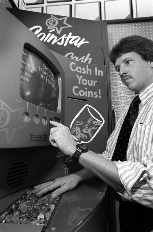 Since debuting in 1992, Coinstar machines have processed over one trillion little metal discs. About 40 percent of America’s recirculated coins (worth $2.3 billion) have rattled through a Coinstar kiosk.Credit...Al Seib/Los Angeles Times, via Getty Images