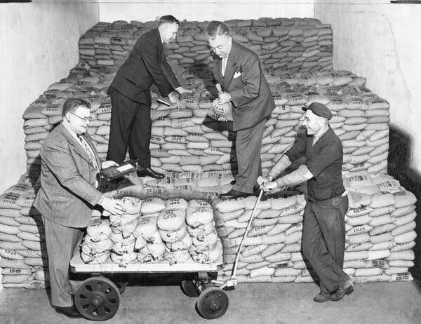 In the process of counting one hundred million pennies (or rather, one million dollars' worth of pennies) at the San Francisco Mint in 1950. One cent in 1950 was the monetary equivalent of 13 cents in 2024.Credit...Barney Peterson/San Francisco Chronicle, via Getty Images