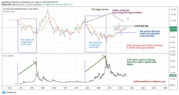 The chart above, shows the US Dollar index vs the Silver Price chart. On the chart, I have marked two patterns (1 to 4) that could potentially be similar, and exist in similar context (just after a major bottom in the US Dollar index).