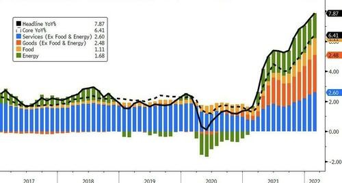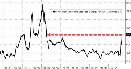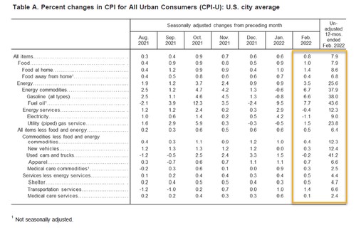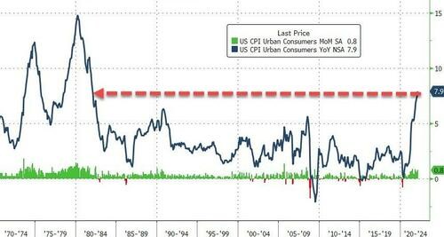 With the Biden administration already setting the narrative yesterday that today's inflation print could be 'high', and expectations for a headline print of +7.9% YoY (from +7.5% YoY in January), the bar was high for any surprises and the headline print came in right in the dot at +7.9% YoY - the highest since Jan 1982.