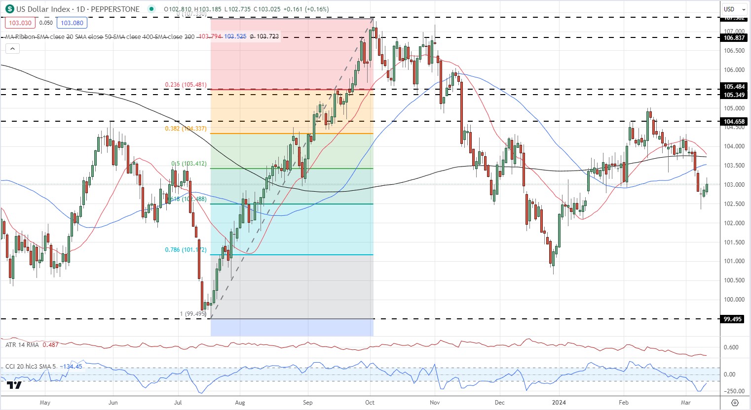 The US dollar picked up a small bid after the results with the US dollar index back above 103.00. Market probabilities for future US rate cuts however remained unchanged with the probability of a June rate cut still over 80%.
