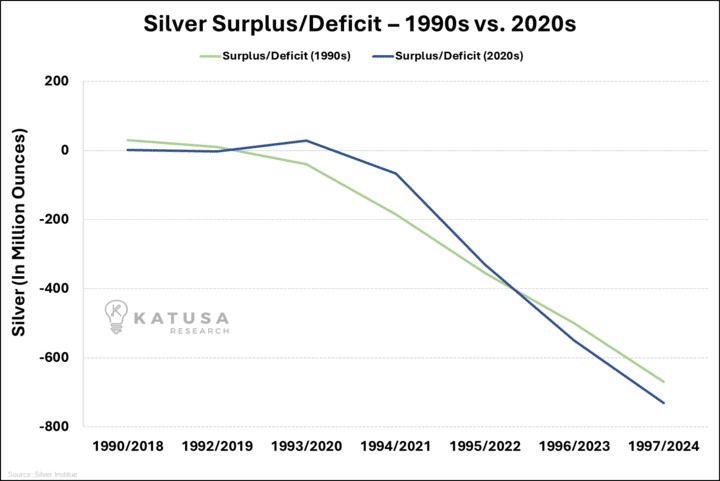 And Sprott Asset Management predicts that the annual deficit will continue, averaging more than 200M ounces through 2030.