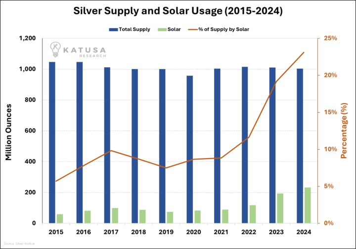 Solar has taken over from photography as the primary demand driver for silver, and demand is skyrocketing.