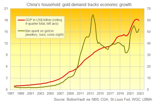 Not for sure and most certainly no, respectively. But on balance, gold has come into 2023 with global household demand already back to pre-Covid levels at prices very much higher, while Chinese consumers – finally released from lockdown both economically and socially – show no sign of snapping the long-term link between their spending on gold and the country's GDP growth.