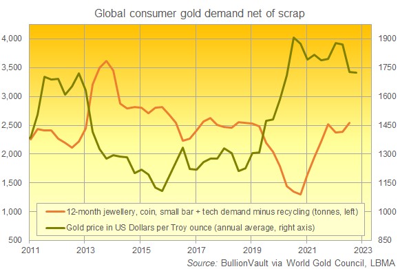 As you can see, the best available gold demand data – gathered, analysed and compiled by specialists Metals Focus for the mining industry's World Gold Council (and due to include Q4 2022 very shortly) – show that net of recycling flows (aka 'scrap'), total consumer demand worldwide last year recovered its pre-Covid levels.